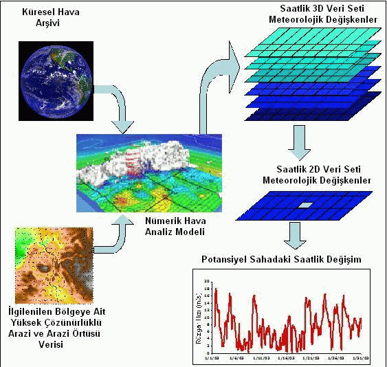 Türkiye Rüzgar Enerjisi Potansiyel Atlası, coğrafi bilgi sistemi yazılımları, yazılım geliştirme araçları, nümerik hava analiz modelleri kullanılarak hazırlanmıştır (Şekil 7). Haritalama işlemlerinde coğrafi bilgi sistemleri ürünleri kullanılmıştır. Ancak, hazır ticari yazılım olarak mevcut olan ürünler, rüzgar verisinin işlenmesi ve analiz edilmesi gibi özel işlevler gerektiren bir uygulama için yetersiz kalmaktadır. Bu sebeple, yapılan çalışmada coğrafi bilgi sistemi temel özelliklerinin yanısıra, özel bir uygulama yazılımı geliştirilerek, rüzgar kaynağı verilerinin işlenmesine, sorgulanmasına ve analiz edilmesine de imkan sağlanmıştır. Model sonuçları gerçek ölçümlerle kontrol edilerek istenilen doğruluk seviyesinde ürünler üretilmiştir. Model sonuçları bir yazılım haline getirilmiştir (Şekil 8-9) ve WEB ortamından kullanıcılara açılmıştır (Şekil 10).